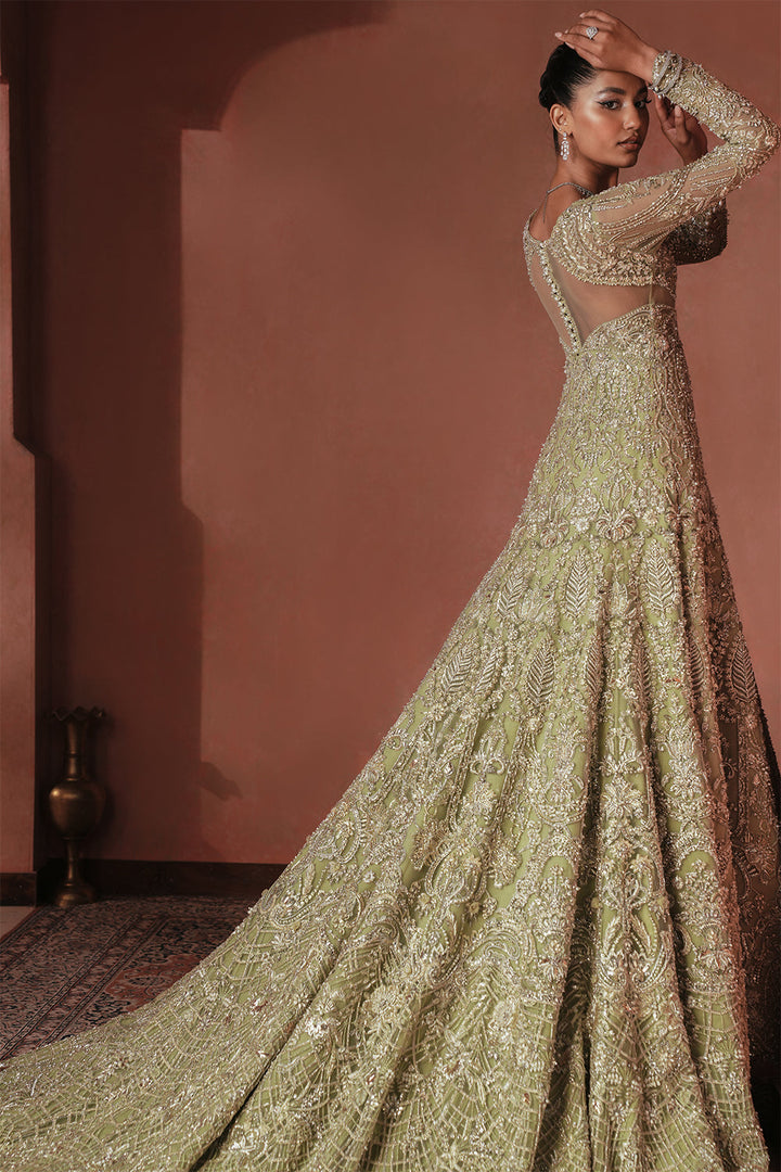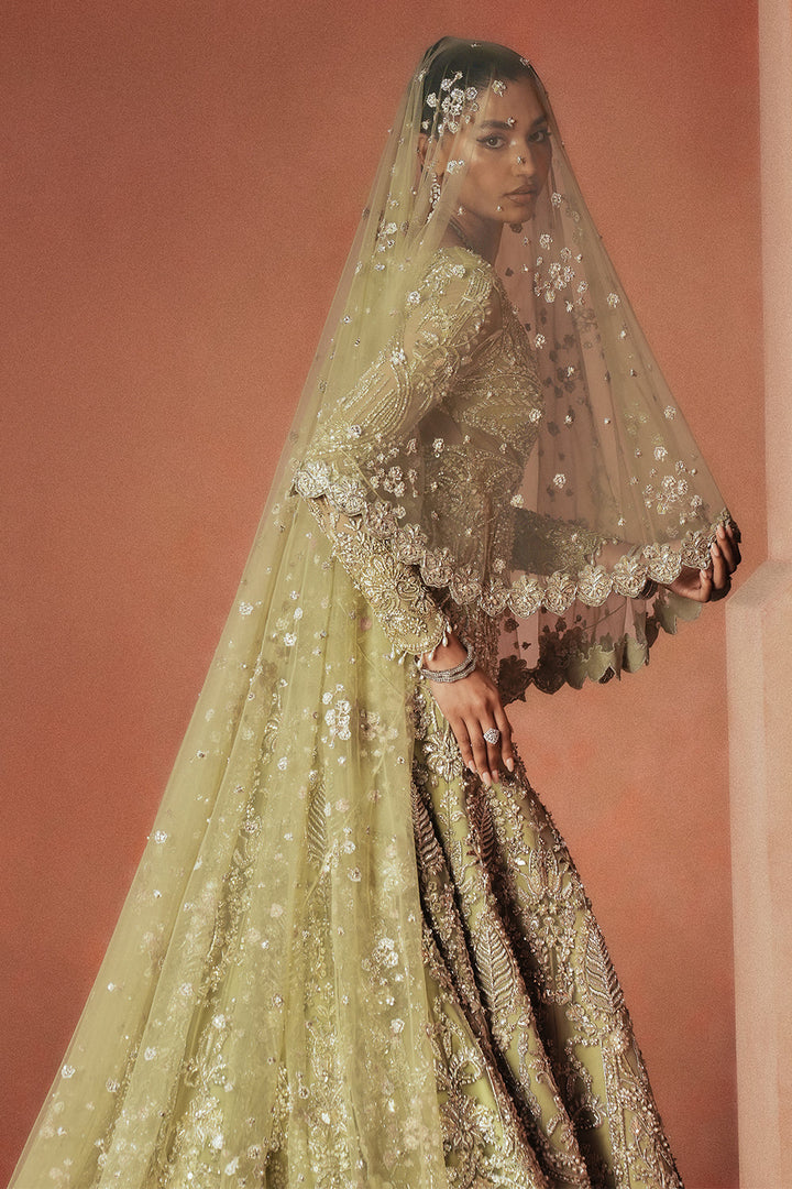 Enchanting in sage, a flowing trail back of ethereal premium net. Hand-embellished with exquisite detail, shimmering naqshi, delicate dabka, and mirror accents. Mukesh, fine cutwork, and dimensional 3D elements, all meticulously crafted by master artisans. Duppata ready to wear four-sided embroidered.