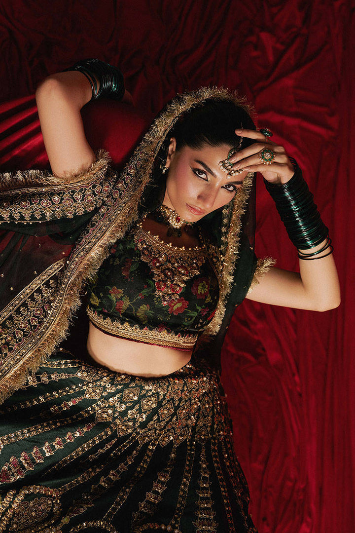 Gul-e-Khaas is something rare done in dark green Indian silk ensemble, bold and botanical, starts with a sleeveless choli in floral printed silk, traced with golden embroidery across the neckline and straps like delicate vines creeping along marble. The lehenga spills open like a secret Mughal garden, featuring appliqués of the same floral print, layered over block-printed motifs and enhanced with gota patti, mirror work, and fine hand embroidery. The spade-like motifs cascade downward and transform into intricate geometric patterns inspired by Mughal ceiling art symmetrical, hypnotic, and rich in detail. Lines of sequins and mirrorwork slash through the skirt like glints of sun in foliage. The hemline is a spectacle unto itself, with an ornate Mughal border densely embroidered in golden threadwork. The matching organza dupatta is no less opulent, blooming with large and small printed flowers at both ends, accented with gota patti and adda work, framed by embroidered borders and finished with charming kiran trims and fluttering tassels