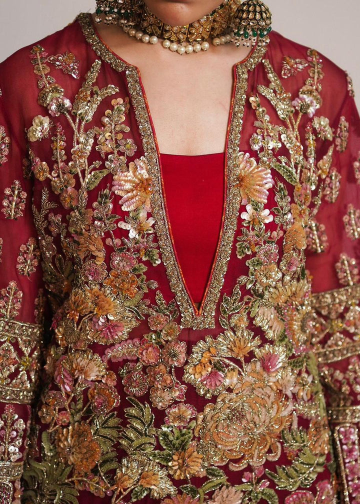 Rendered in a soothing shade of red berry features long organza shirt with satin silk bustier. Shirt is fully embellished with a bold modern floral jaal along with heavy and chunky borders on ghera and on side slits. This captivating shirt is paired with velvet pants, finished with heavy embellished borders. It is further elaborated with a breathable chiffon duppata with heavy sequins chatta and four side border concluding the look marvellously.