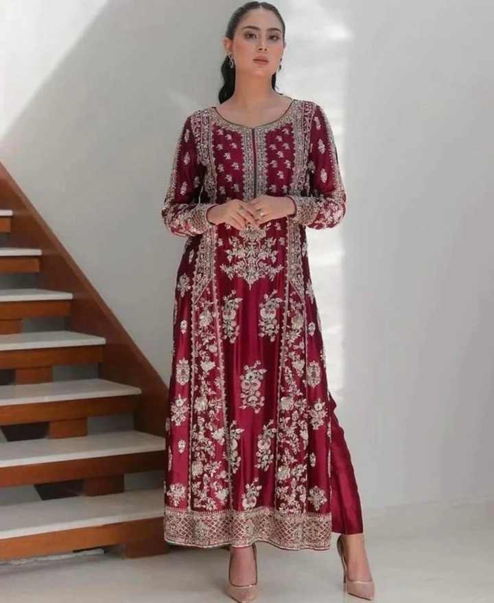 A deep maroon ensemble adorned with intricate silver thread work and delicate floral embroidery. The luxurious fabric flows gracefully, enhanced by detailed patterns that reflect classic Eastern craftsmanship. Flattering straight cut with full sleeves and a round neckline, this design strikes the perfect balance between traditional charm. The embellished borders and rich embroidery make it an ideal choice for festive occasions, weddings, or formal gatherings.
